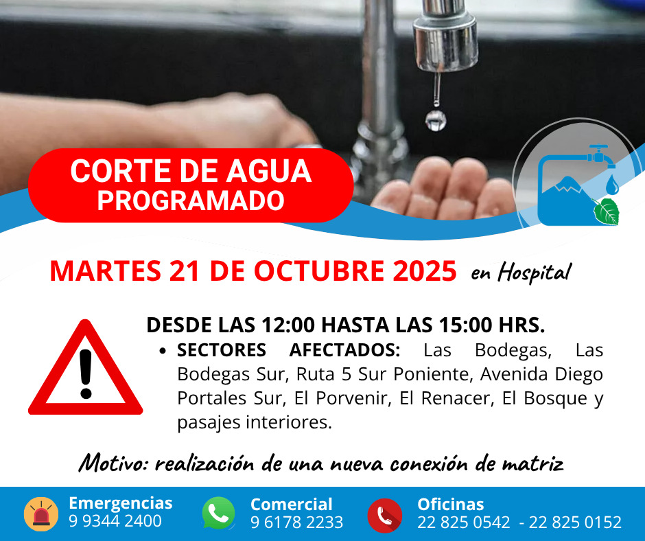 Hospital, 14-10-2025 – Estimados socios y socias, informamos que por motivo de una nueva conexión de matriz en el sector de Hospital, se realizará un corte programado de agua potable.